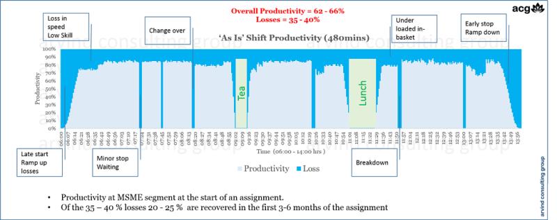 By admin / May 9, 2021 Productivity at MSME Productivity of an MSME before engagement for a 480 min shift Productivity at MSME Productivity of an MSME before engagement for a 480 min shift